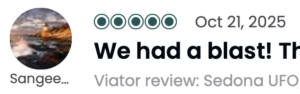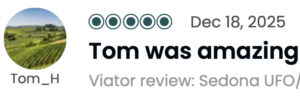….”We had a great time at the Sedona UFO/Stargazing Tour. Our tour guide Tom, had a lot of experience conducting these tours and was very knowledgeable about the night sky, the stars and the constellations. It was quite spectacular. “